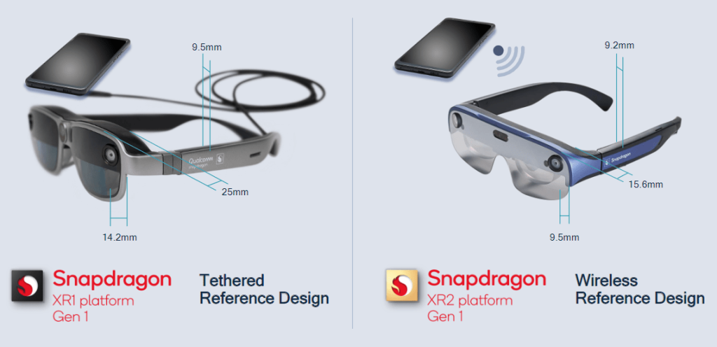 O AR Smart Viewer da Qualcomm traz um design elegante e com funcionalidades mais avançadas, se comparado ao modelo lançado pela empresa no ano de 2021 para o Snapdragon XR 1. Diferentemente da versão anterior, os óculos anunciados hoje poderão funcionar nem a necessidade de fios, o que é um grande diferencial. Tendo o seu visual desenvolvido pela Goertek, os óculos da Qualcomm agora são 40% mais finos e mais leve que o modelo anterior, pesando apenas 115, hastes de 9,2 mm, armação de 15,6 mm e lentes de 9,5 mm. Em comparação, o modelo de referência da geração anterior possui hastes de 9,5 mm, armação de 25 mm e lentes de 14,2 mm. As mudanças trazem uma melhor ergonomia e mais conforto. Com um display binocular micro-OLED de 049″, o dispositivo possui resolução de 1920×1080 por olho e taxas de atualização de quadros de até 90Hz. O aparelho também incorpora duas câmeras monocromáticas e uma terceira RGB que auxiliam no rastreamento de cabeça e mãos, inclusive, com um maior reconhecimento de gestos, fornecendo uma maior precisão durante o seu uso.
